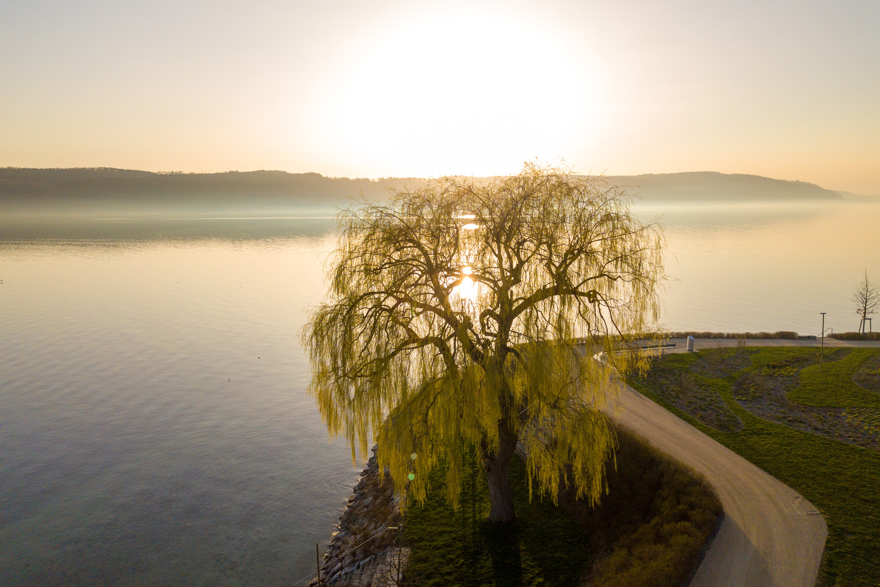 Sonnenaufgang über dem See am Tag des Inseltransports.